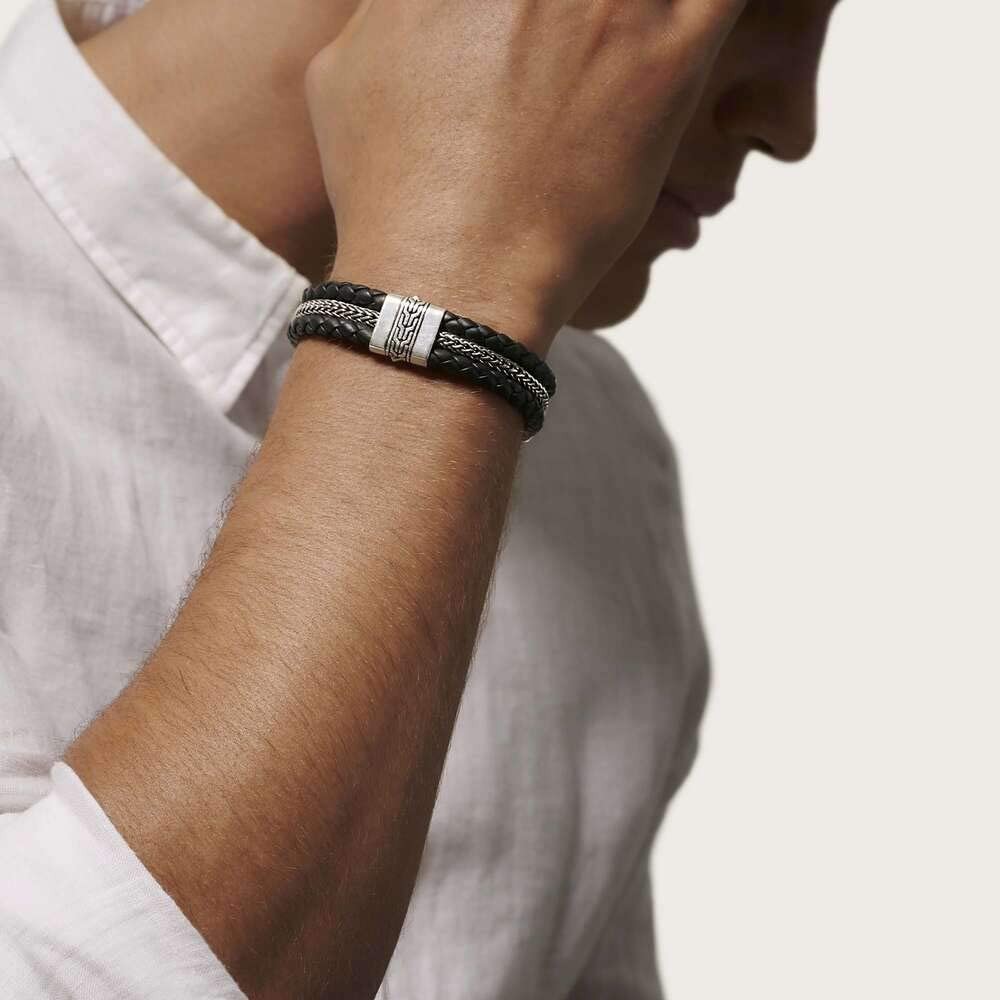 這款標誌性的經典鍊式手鍊展現現代陽剛之氣,展現了 925 純銀和黑色編織皮革的獨特對比。